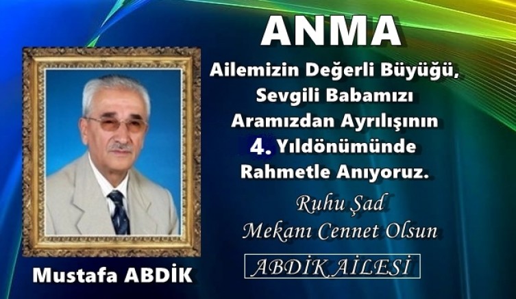 sevgi ve Saygıdeğer Babamz Mustafa Abdik'i Vefatının 4. Yıldönümünde Satgı, Şükran ve Dua ile Anıyoruz. Ruhu Şad Mekanı Cennet Olsun. Biz Sende Razıydık, Allah'ta Senden Razı Olsun.