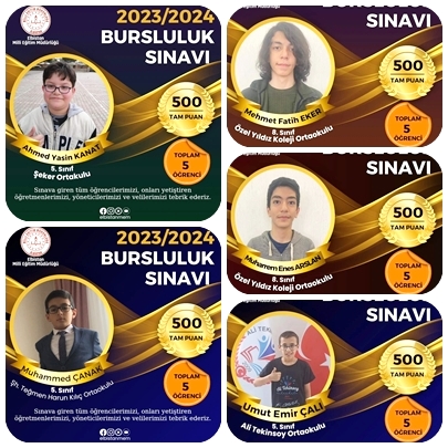 Milli Eğitim Bakanlığı’nca düzenlenen İlköğretim ve Ortaöğretim Kurumları Bursluluk Sınavı sonuçları açıklandı. Elbistan’da 4 bin 580 öğrencinin girdiği sınavda, ülke genelindeki 70 bin öğrenci başarılı olarak burs almaya hak kazandı. Sınav sonucunda Elbistan’da, Ali Tekinsoy Ortaokulu öğrencisi Umut Emir Çalı, Şeker Ortaokulu öğrencisi Ahmed Yasin Kanat, Şehit Teğmen Harun Kılınç Ortaokulu öğrencisi Muhammed Çanak, Özel Yıldız Ortaokulu öğrencileri Muharrem Enes Arslan ve Mehmet Fatih Eker, tüm soruları doğru cevaplayarak 500 tam puan alıp Türkiye birincisi oldu.