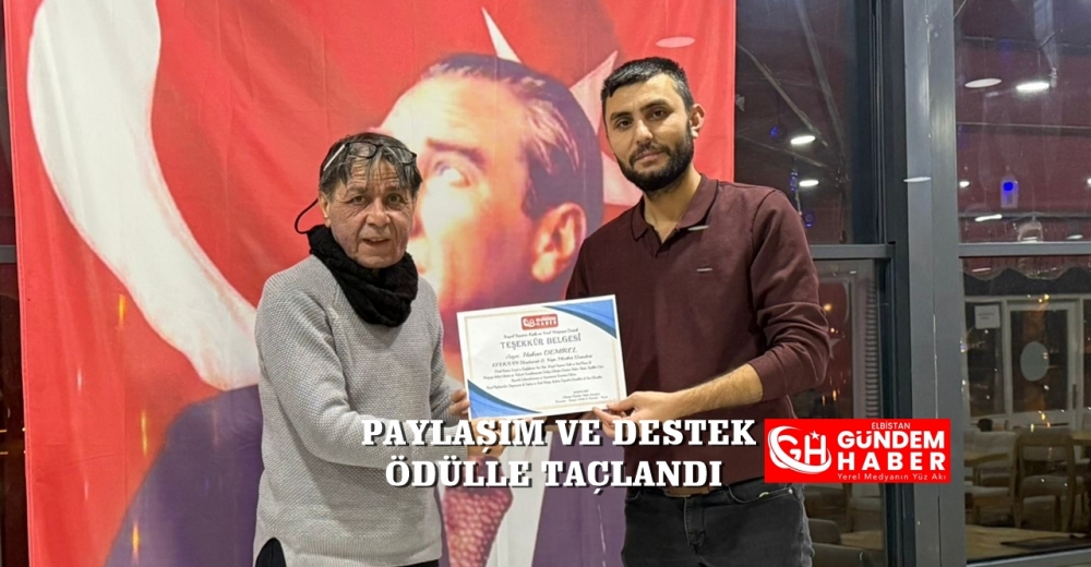 Periyodik olarak her hafta sonu Cuma günü akşamları Elbistan Belediyesi Pınarbaşı Mükrime Hatun Kültür Evi Sosyal Tesislerinde gerçekleşen, aileye dönük müzik, eğlence ve dostluk gecesine katkı sağlayan, yardımsever paylaşımları ile birçok anlamlı organizeye imza atan EFEKAAN Hırdavat ve Yapı Market İşletme Sahibi Hakan Demirel’e Elbistan Gündem Haber Gazetesi Kurucusu ve İmtiyaz Sahibi Hasanaki tarafından teşekkür belgesi takdim edildi.