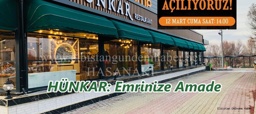 Lokantacılık ve restaurant sektörü zincirine bir halka daha ekleniyor: HÜNKÂR Restaurant. Mekânı, dekoru, sakin ortamı, huzuru ve A kalite ürünleri ile HÜNKÂR Restaurant 12 Mart 2021 Cuma günü saat 14.00’te Elbistan ve bölge halkına merhaba diyecek.