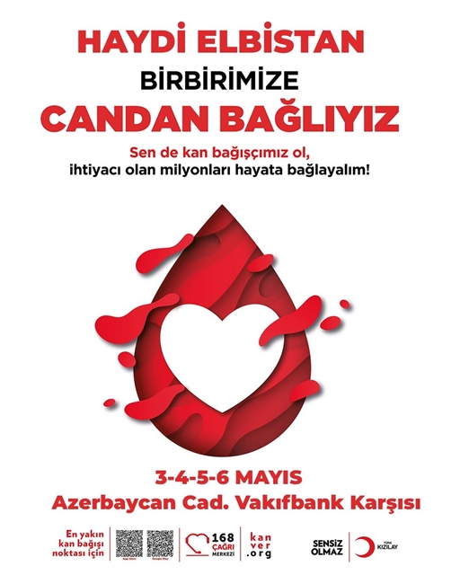Türk Kızılay'ın başlatmış olduğu ‘Birbirimize Candan Bağlıyız Elbistan’ sloganıyla Elbistanlı vatandaşlardan rekor kan bağışı bekliyor. 3-4-5-6 Mayıs tarihleri arasında Azerbaycan Caddesi Vakıfbank Karşısında konuşlanacak olan kan tırı Elbistanlı vatandaşları bekliyor olacak.
