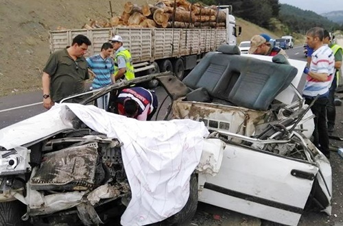 3 kişiye mezar olan korkunç kaza, Kahramanmaraş-Göksun karayolunda meydana geldi. Alınan bilgilere göre Beşoluk mevkiinde sürücüsünün ismi henüz bilinmeyen 46 N 2413 plakalı otomobil, sürücüsünün ismi ilk etapta tespit edilemeyen tomruk yüklü 27 BDF 20 plakalı kamyona arkadan çarptı.