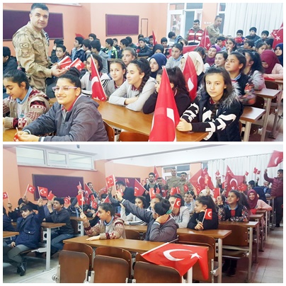 Öğrencilere tavsiyelerde bulunan jandarma personelleri, vatanını sevmenin her şeyden önce çok çalışmaktan geçtiğine vurgu yaptılar. Jandarma personelleri, gerek vatan savunmasında gerekse ay yıldızlı şanlı bayrağımızın ilelebet dalgalanması için nöbeti devralacak kocaman yürekli öğrencilere Afrin’de sürdürülen Zeytin Dalı Harekatı hakkında da bilgiler verdiler.