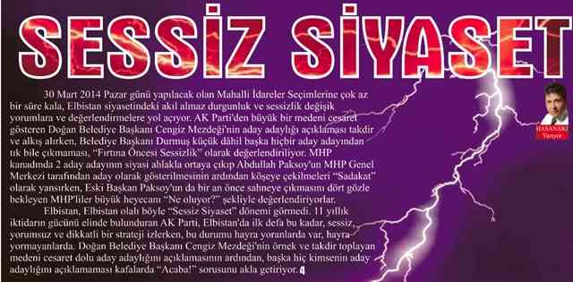 30 Mart 2014 Pazar günü yapılacak olan Mahalli İdareler Seçimlerine çok az bir süre kala, Elbistan siyasetindeki akıl almaz durgunluk ve sessizlik değişik yorumlara ve değerlendirmelere yol açıyor. AK Parti’den büyük bir medeni cesaret gösteren Doğan Belediye Başkanı Cengiz Mezdeği’nin aday adaylığı açıklaması takdir ve alkış alırken, Belediye Başkanı Durmuş küçük dâhil başka hiçbir aday adayından tık bile çıkmaması, “Fırtına Öncesi Sessizlik” olarak değerlendiriliyor. MHP kanadında 2 aday adayının siyasi ahlakla ortaya çıkıp Abdullah Paksoy’un MHP Genel Merkezi tarafından aday olarak gösterilmesinin ardından köşeye çekilmeleri “Sadakat” olarak yansırken, Eski Başkan Paksoy’un da bir an önce sahneye çıkmasını dört gözle bekleyen MHP’liler büyük heyecanı “Ne oluyor?” şekliyle değerlendiriyorlar.