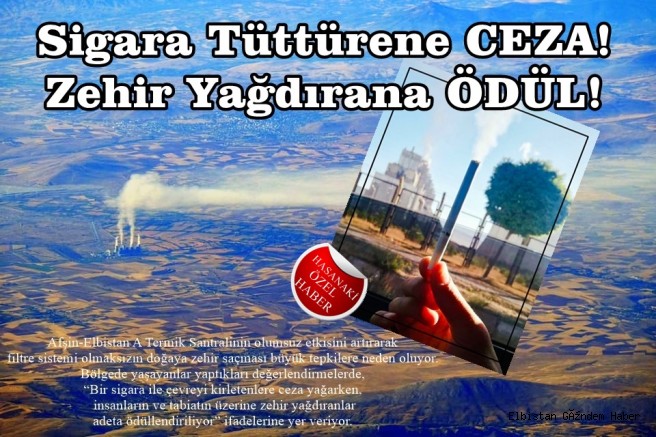 Afşin-Elbistan A Termik Santralinin olumsuz etkisini artırarak filtre sistemi olmaksızın doğaya zehir saçması büyük tepkilere neden oluyor. Bölgede yaşayanlar yaptıkları değerlendirmelerde, “Bir sigara ile çevreyi kirletenlere ceza yağarken, insanların ve tabiatın üzerine zehir yağdıranlar adeta ödüllendiriliyor” ifadelerine yer veriyor.