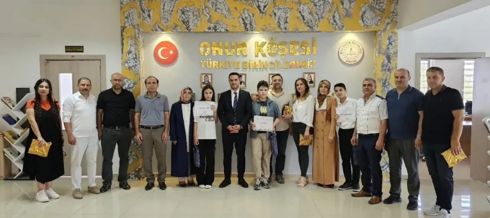 Elbistan Milli Eğitim Müdürü Fatih Çetin, şube müdürü Bünyamin Özdemir’le birlikte şampiyon öğrencileri, ailelerini ve okul müdürlerini makamında misafir etti.