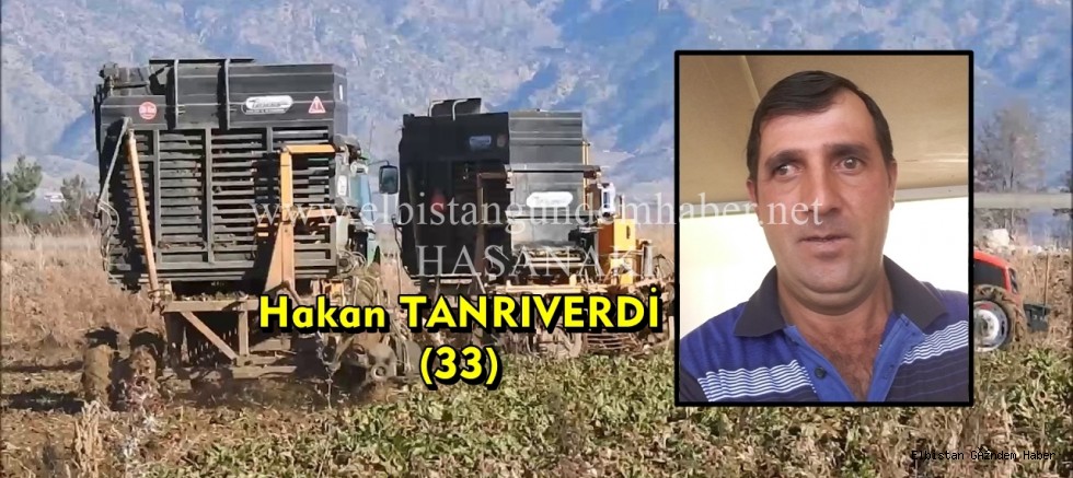 33 yaşındaki Hakan Tanrıverdi, tarlada şekerpancarı sökümü için kullanılan makinenin altında kaldı. Tonlarca ağırlıktaki makinenin üzerinden geçtiği Tanrıverdi, ağır yaralandı. Tarladaki yakınları tarafından hastaneye kaldırılan Tanrıverdi, doktorların tüm müdahalesine rağmen kurtarılamayarak hayatını kaybetti. Izgın Mahallesi nüfusuna kayıtlı olduğu öğrenilen Tanriverdi'nin cansız bedeni otopsi için Elbistan Devlet Hastanesi morguna kaldırıldı. Olayla ilgili olarak başlatılan soruşturma devam ediyor.