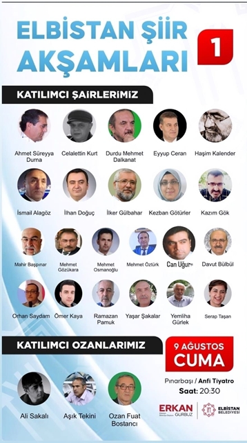 Elbistan Belediyesi’nin düzenlemiş olduğu “Şiir Akşamları” etkinliği Pınarbaşı Mesire Alanında bulunan amfi tiyatro alanında 9 Ağustos Cuma günü saat 20:30’da gerçekleştirilecek. Programda 22 şair ve 3 ozan sahne alacak.