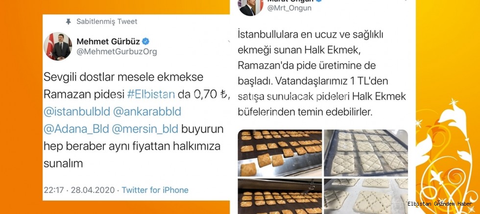 Elbistan Belediyesi, Halk Ekmek’te üretilen Ramazan pidesini vatandaşların sofralarına 70 kuruştan ulaştırarak örnek bir davranış sergiliyor. Elbistan Belediye Başkanı Mehmet Gürbüz, vatandaşların Ramazan pidesini daha ucuza almaları için twitter hesabından İstanbul, Ankara, Adana ve Mersin büyükşehir belediyelerini etiketleyerek, "Sevgili dostlar; mesele ekmekse Elbistan'da Ramazan pidesi 70 kuruş. Buyurun hep beraber aynı fiyattan halkımıza sunalım” şeklinde çağrıda bulunmuştu. Başkan Gürbüz’ün bu çağrısı, sosyal medyada çok beğenilmiş ve trend topic listesine girmişti. Başkan Gürbüz’ün bu çağrısının karşılık bulduğu ilk belediye ise İstanbul Büyükşehir Belediyesi oldu.
